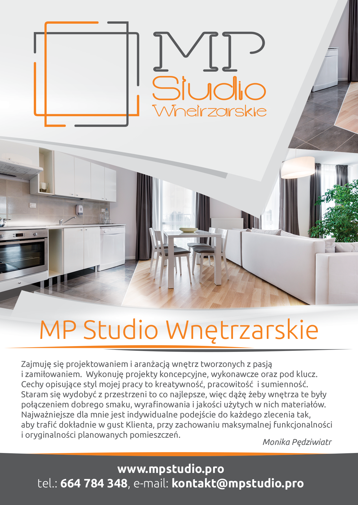 MP Studio Wnętrzarskie Monika Pędziwiatr. Projektowanie i architektura wnętrz. Wnętrza mieszkalne, wnętrza biurowe, reprezentacyjne. Salony sprzedaży, sklepy i inne obiekty handlowe, Restauracje, bary i hotele. Gabinety medyczne, kosmetyczne.