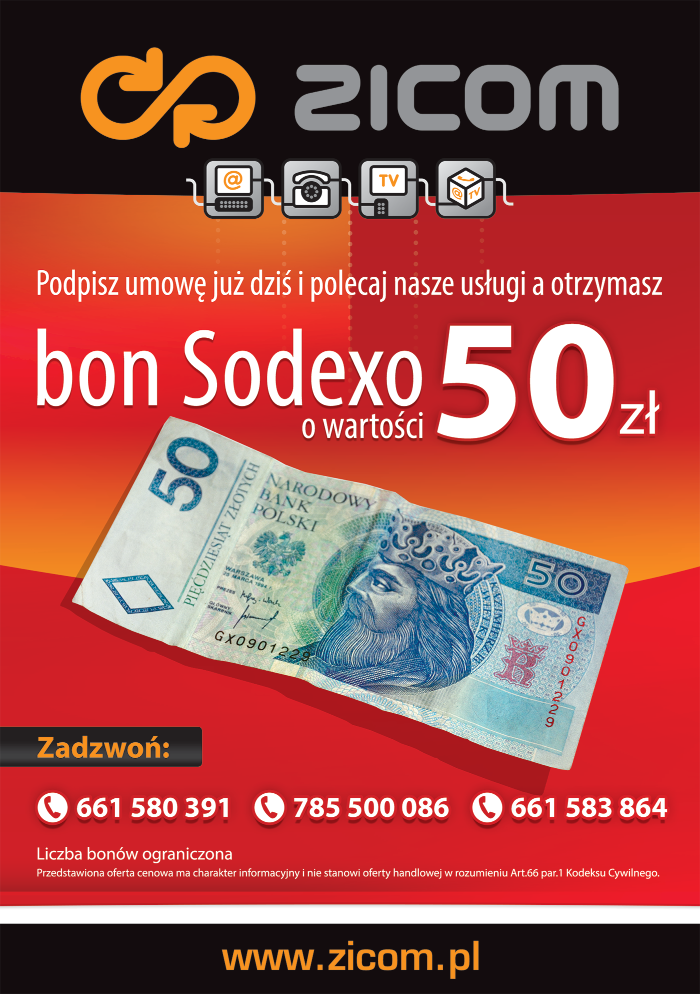 Promocja pakietów usług firmy ZICOM: Internet, Telefon i Telewizja Światłowodowa HD. W pakiecie taniej.